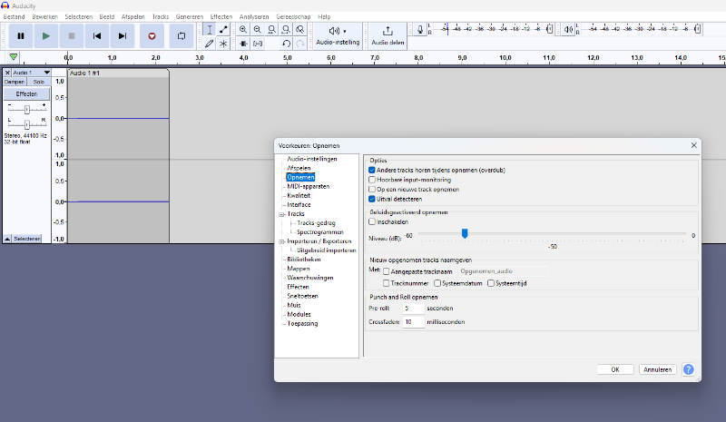 Dan doe je iets niet goed.het opnemen zal dan zonder geluid zijn ook al neem je in audacity de instelling Windows DirectSound er komt gewoon geen geluid door .. audacity zal wel opnemen maar je hoort niets ...pas als je het opnemen stopt en je speelt hetgene af wat je opgenomen heb dan hoor je dit ook maar let op het geluid is eerder gedempt ...proef vindelijk ondervonden dat ik mijn volume geheel open moet zetten om ook maar iets te horen !