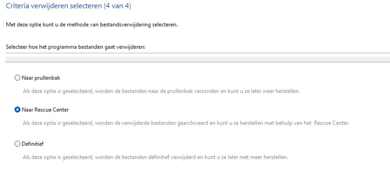 En in laatste instantie kun je de bij de instellingen geselecteerde doelmap voor de bestanden die je gaat verwijderen nog wijzigen. Zoals je kunt zien was in mijn geval de Prullenbak als standaard doel ingesteld. Je doet er dan wel goed aan om de prullenbak vooraf te legen.