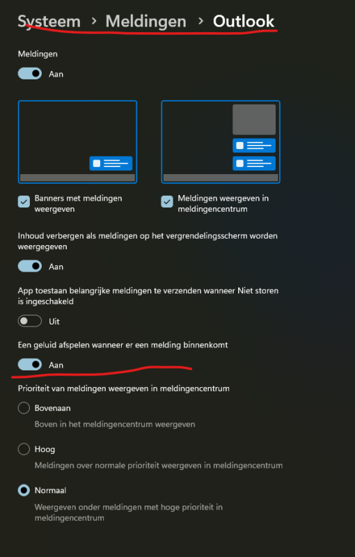 Ik krijg geen geluid bij inkomende email. (Outlook office, MS.-365, Windows 10, IMAP account).