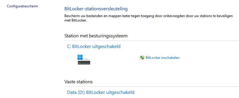 heb eens opgezocht via het vergrootglas naar bitlocker, die staat uitgeschakeld, dus ik moet mij geen zorgen maken denk ik.Bij windwos 11 is bitlocker trouwens standaard ingeschakeld.