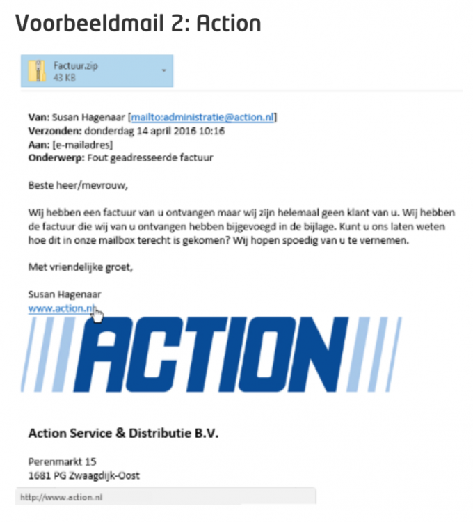 Kijk niet alleen naar de naam van de afzender, maar ook naar het precieze afzendadres. Is dit een vreemd adres, of een afgeleide versie van de echte naam van een bestaand bedrijf? Dan is het waarschijnlijk foute boel.