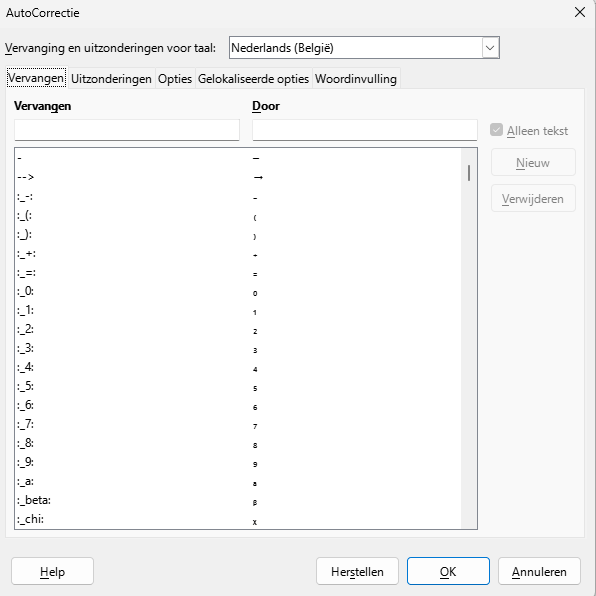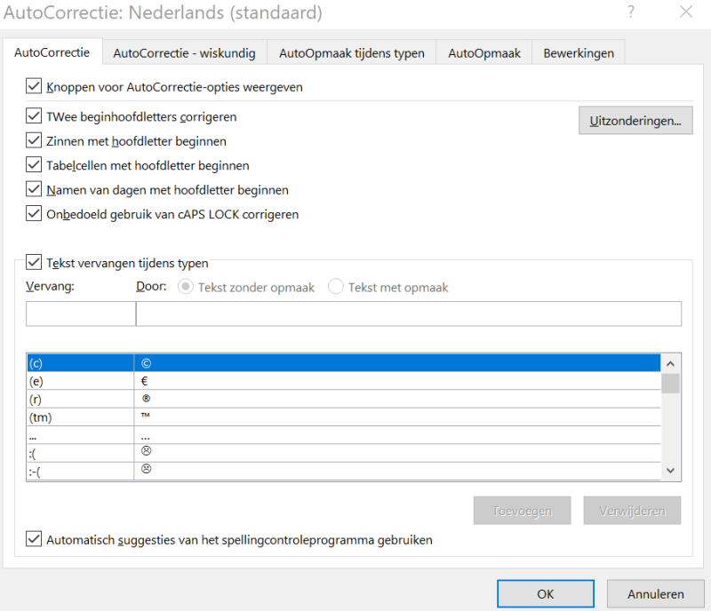 - **Vervangingen en uitzonderingen**: Dit tabblad bevat lijsten van woorden en zinnen die automatisch worden vervangen. Je kunt hier ook nieuwe vervangingen toevoegen of bestaande aanpassen.