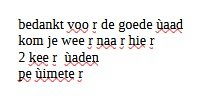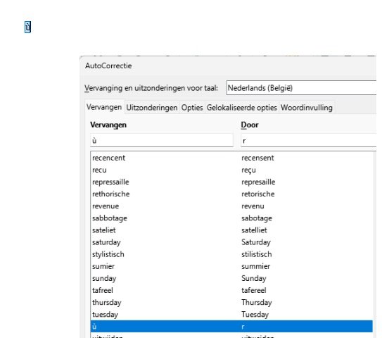 PhilipV, tja logisch denken, zeker op gebied van computers, is niet echt mijn specialiteit... Ik heb er eens een spatie voor gezet en dan lukt het inderdaad wel... Maar enkel op het einde van een woord. Niet in het midden en niet in het begin van een woord... Dan zit ik weer met al die overtollige spaties... Dus spatie+ù wordt 'r'...