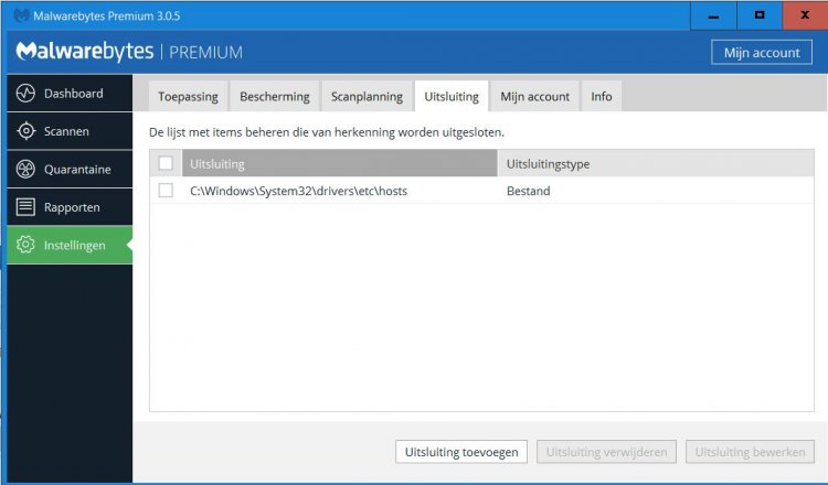 open malewarebytes >ga naar "instellingen ">uitsluiting en voeg ""C:\Windows\System32\drivers\etc\hosts"" eens toe ...(zonder haakjes )