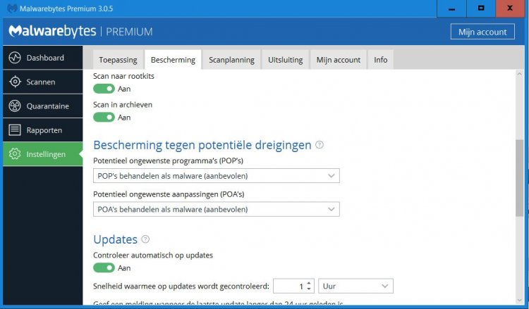 Mbam opnieuw er op gezet. Geeft Liftime aan en geactiveerd. Host file is uitgesloten.