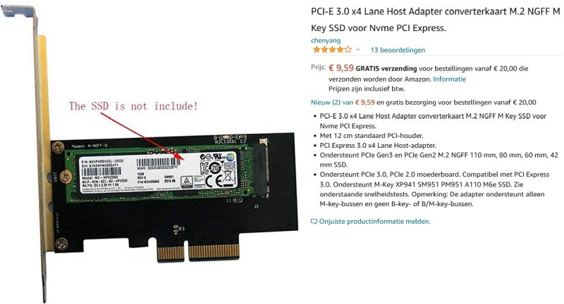Misschien omdat de vraag niet duidelijk gesteld werd. Wat is juist de bedoeling? Die NVMe inbouwen via een adapter of een externe USB-adapter naar een interne SATA SSD? Of gewoon een insteekkaart waar die NVMe in past en zo in de pc inbouwen. Veel mogelijkheden dus graag iets meer duiding.Beste Mensen leuk voor die antwoorden maar dat was niet mijn vraag