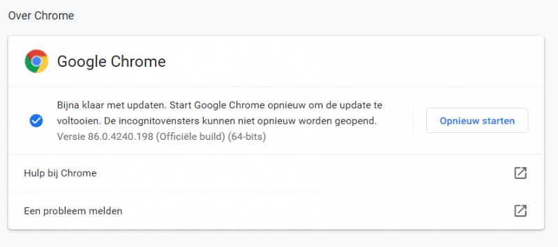 Telkens wanneer ik probeer Chrome te updaten naar een nieuwere versie via "Help" - "Over Google Chrome"