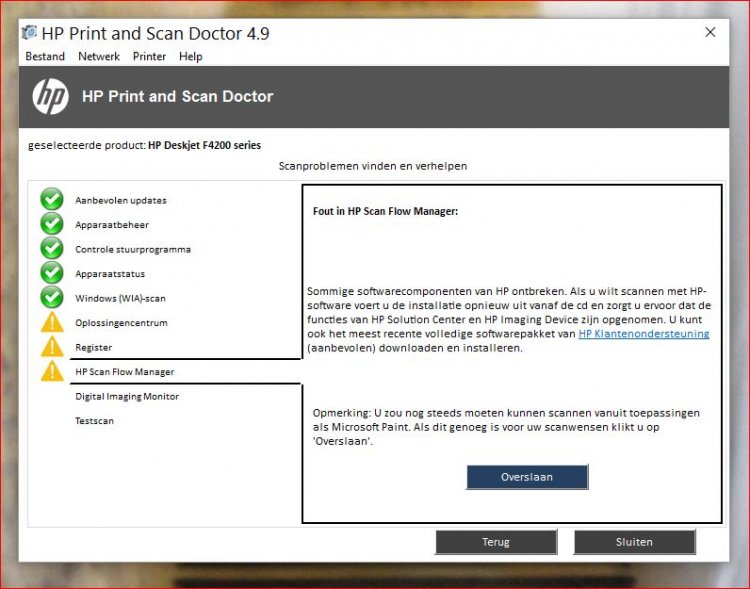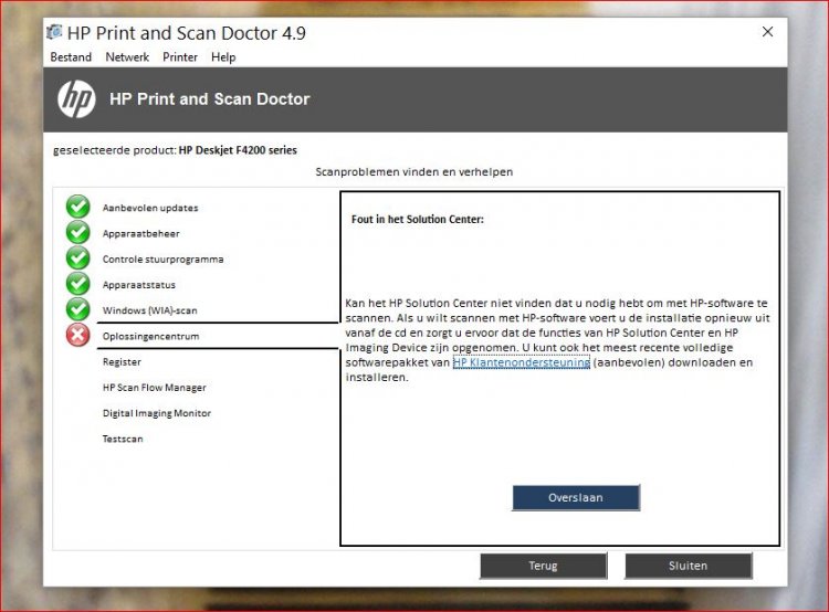 Kortom het printen en scannen werkt nu wel maar wel via een omweg en steeds weer nieuwe meldingen bij het opstarten dat het programma HP niet naar behoren werkt. Tamelijk vervelend !!!