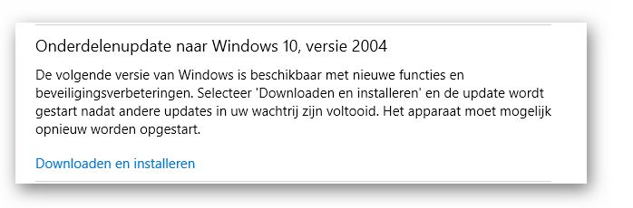 Prima. Dan wil jij dus gewoon de upgrade uitvoeren naar de nieuwste versie van Windows 10. Versie 2004 is blijkbaar nu beschikbaar voor jouw computer.