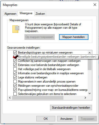 je heb wel het verborgen bestanden , mappen en stations weergeven aangezet maar daar heb ik het niet over (tevens dient deze wel aangevinkt te zijn maar heb ik het over een andere regel )