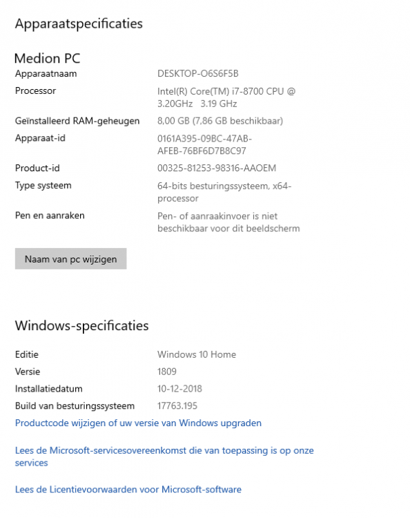 Ik heb vorige week een nieuwe Medion Pc Md 34135 gekocht met voor geïnstalleerd Win 10 home Versie 1809 build 17763.195.
