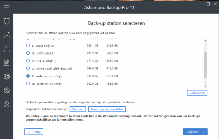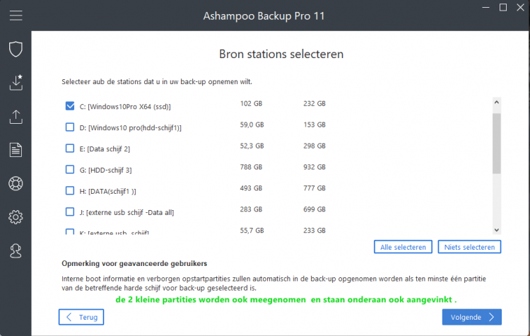 daar kan ik alleen stations veranderen, ik kies ze allemaal behalve de EHD die daartussen staat vink ik niet aan, en dan kan ik alleen nog klikken op back-up nu starten