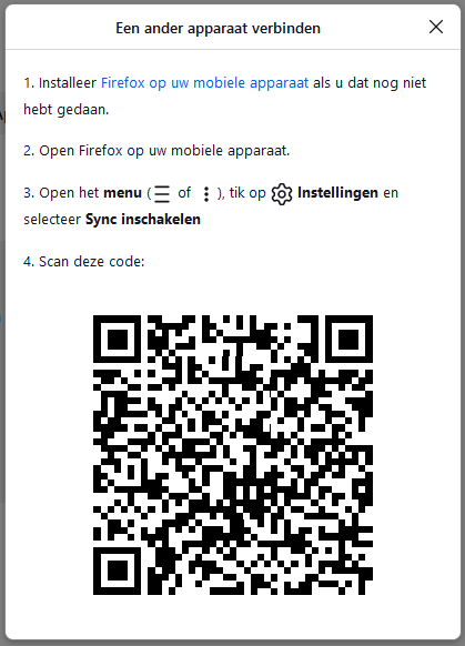PC\Firefox\Menu(3streepjes)\KlikAccount\Een ander apparaat verbinden\Code tonen\ ...dan krijg je volgende popup: zie afb.