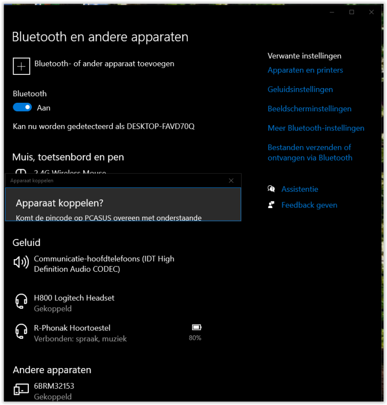 als ik mijn assus laptop wil koppelen met Pc zie ik de pc op mijn laptop en krijg ik daar een code die ik moetvergelijken met de code van mijn pc maar daar zie ik de code niet bijgevolg is er geen koppeling als je ziet wat ik krijg op mijn PC zie bijvoegsel word er geen code getoond