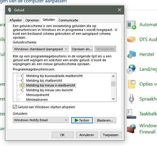 scrol naar melding bij nieuw emailbericht en hier zou dan het geluid geselecteerd dienen te worden van je voorkeur .. bij mij althans kies ik voor Windows Notify Email ..