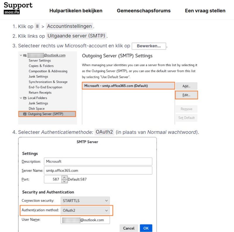 Het gaat om een bekende (82 jaar), die Windows 10 gebruikt en voor zijn e-mail Thunderbird. Sinds een week of twee kwam er geen mail meer op dat (hotmail.com) account binnen en kon hij ook niets meer verzenden. Na wat zoeken op internet bleek dat Microsoft de verificatie heeft gewijzigd, waardoor het dan niet meer werkt. De oplossing zou zijn om bij de serverinstellingen de Authenticatiemethode in te stellen op "OAuth2" in plaats van "normaal wachtwoord". Dat zou zowel bij de inkomende als uitgaande mail moeten gebeuren. Bij de inkomende mail lukte dat meteen, waarna de "gemiste" mailberichten meteen alsnog binnenkwamen. Dat zou dan ook zo ingesteld moeten worden bij de uitgaande mail (smtp), maar daar kon dat niet omdat die "OAuth2" daar niet in het uitrollijstje stonden, wel 4 anderen. Die anderen heb ik uiteraard wel geprobeerd, maar met geen van die instellingen lukte het om nog mail te versturen. Heeft iemand enig idee hoe ik die optie daar wel krijg bij smtp ?