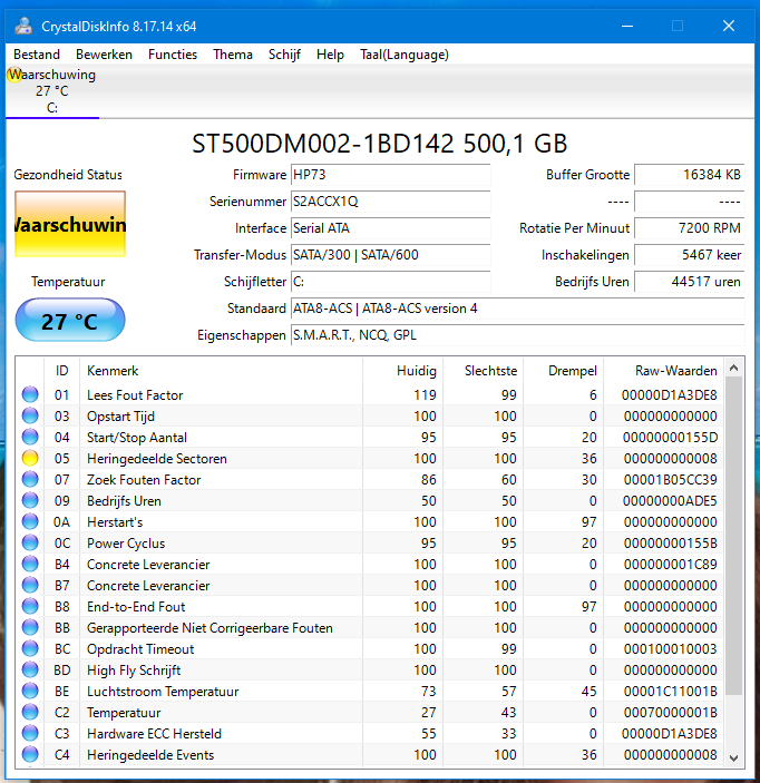 Daarna heb ik voor de zekerheid CrystalDiskInfo geïnstalleerd en die geeft een waarschuwing voor heringedeelde sectoren op mijn HDD.
