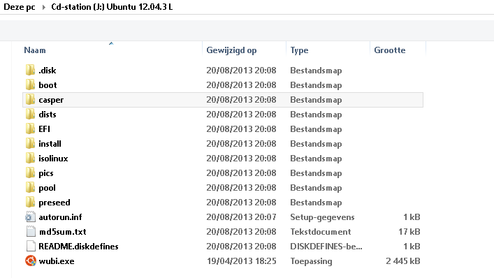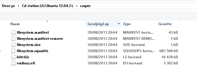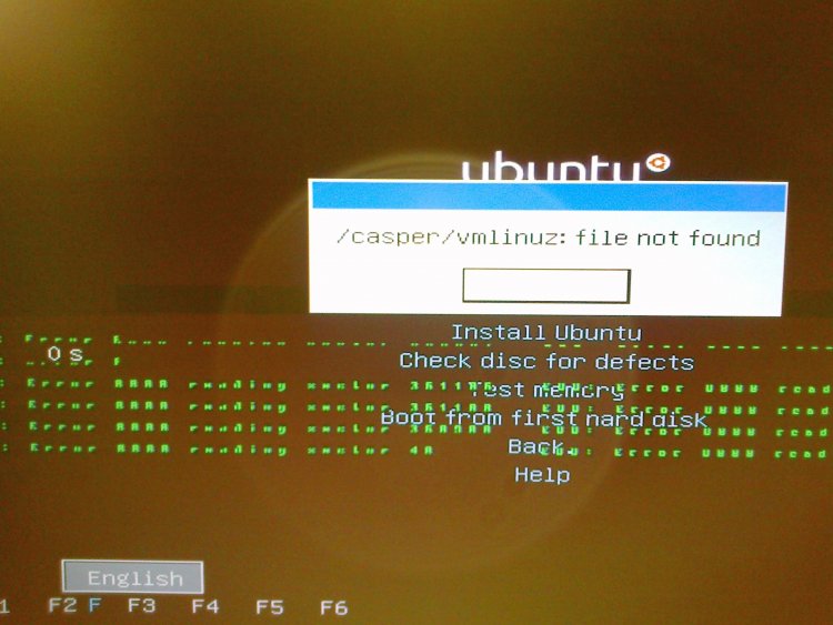 Tot mijn verwondering krijg ik steeds een startscherm in het engels waar ik verschillende keuzes kan maken maar met steeds dezelfde fout: /casper/vmlinuz: file not found.