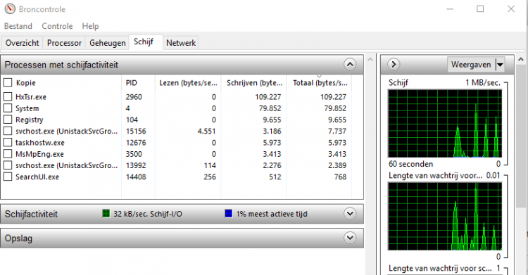 inderdaad dient resmon open te staan ..vroeger onder xp was er iets dat zich in de taakbalk nestelde en door een groen/rood lichtje zag je dan of er een schrijf/lees bewerking bezig was op de schijf maar dat stukje software werkt dus niet meer op de Windows 10