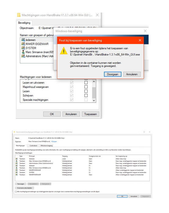 Heb reeds overal toegang gegeven doch komt steeds met foutmelding.