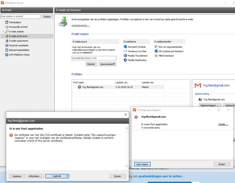 Ik wou graag het gratis programma Mailstore Home gebruiken om mijn mailbox bij Google in backup te nemen.