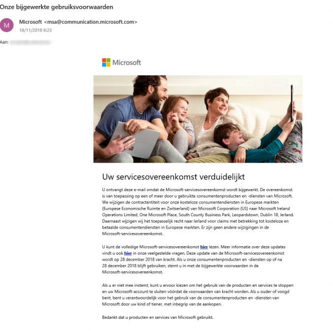 [TD]U ontvangt deze e‑mail omdat de Microsoft‑servicesovereenkomst wordt bijgewerkt. De overeenkomst is van toepassing op een of meer door u gebruikte consumentenproducten en ‑diensten van Microsoft. We wijzigen de contractentiteit voor onze kosteloze consumentendiensten in Europese markten (Europese Economische Ruimte en Zwitserland) van Microsoft Corporation (US) naar Microsoft Ireland Operations Limited, One Microsoft Place, South County Business Park, Leopardstown, Dublin 18, Ierland. Daarnaast wijzigen wij het toepasselijk recht naar Ierland voor claims met betrekking tot kosteloze en betaalde consumentendiensten in Europese markten. Er zijn geen andere wijzigingen in de Microsoft‑servicesovereenkomst.[/TD]