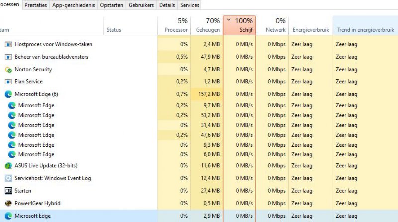 Maar wat ik in de afbeelding zie staan met 100% schijfactiviteit is niet goed. Dan is er iets aan de hand.