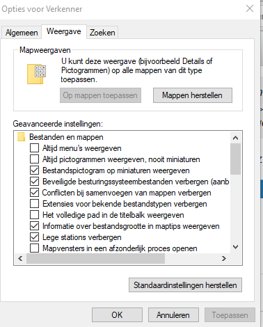 klik verder op zo een blauwe regel ...instellingen weergeven en er opent zich een nieuw scherm "opties voor verkenner "