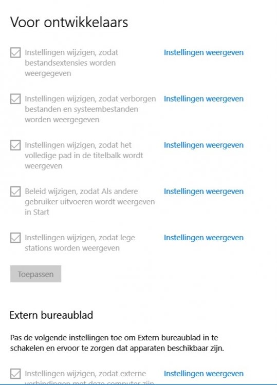 klik start>instellingen >bijwerken en beveiliging > klik op voor ontwikkelaars "scrol naar beneden " en klik op " instellingen weergeven " >klik in het nieuw schermpje op "standaard instellingen herstellen "bevestigen met toepassen en ok