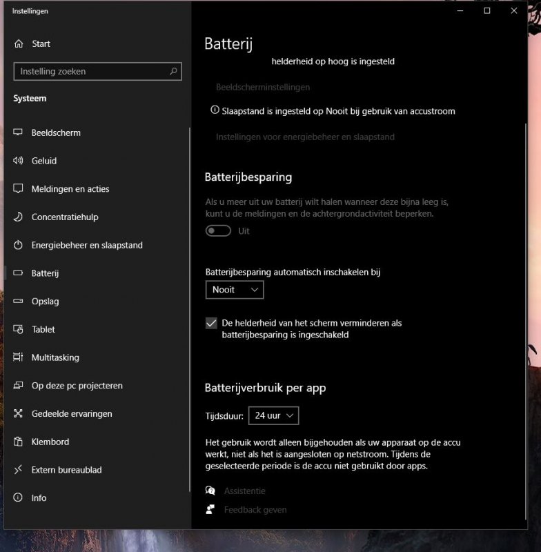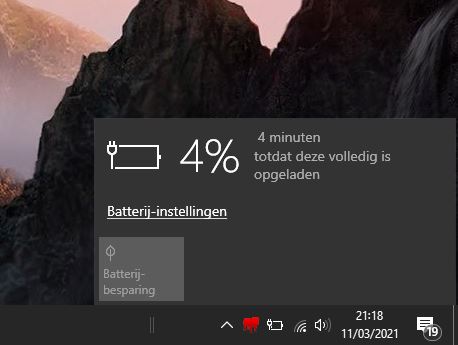 Onderaan rechts bij batterij-instellingen blijft staan ( BATTERIJ 4% opgeladen.) maar werkt niet als de netstroom met adapter uitgetrokken is.