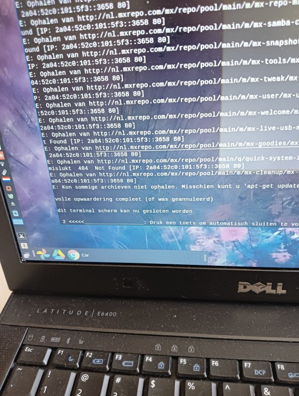 Ik gebruik al een tijdje Linux MX op mijn oude Dell Laptop. Tot op heden ging dat prima, maar nu doet zich een probleem voor met de opwaardering. Er wordt op het scherm aangegeven dat er geupdate moet worden. Wanneer ik vervolgens het updaten in werking zet, lijkt het of de Update niet is gelukt. Er verschijnt er dit scherm (zie bijgevoegde afbeelding)Het groene icoontje, waarmee de Update wordt aangekondigd, blijft ook groen. Wat kan ik doen, om de Update alsnog te doen slagen? De aanbeveling onder E, heb ik al geprobeerd, helaas zonder het gewenste resultaat. Ik hoor het nog graag. Vriendelijke groet,