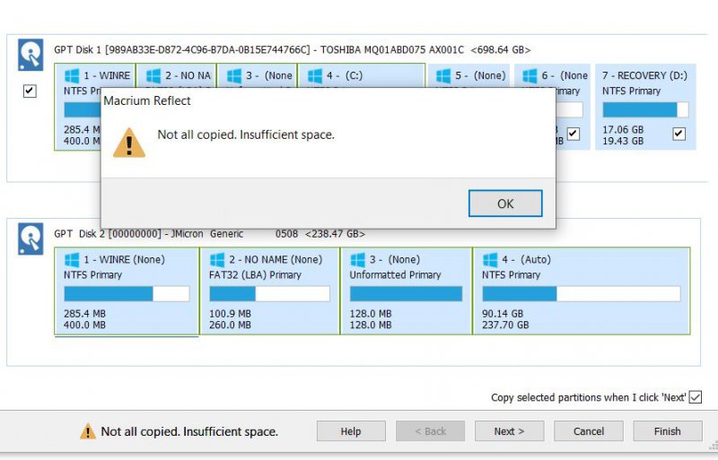 Ik heb een ssd schij gekocht van 256 gb, . Had vooraf de grootte van mijn hdd schijf bekeken via mappenlijst;Ik zag dat de schijf c een grootte had van 90 gb. Dus dacht dat de ss zeker ruim voldoende zou zijn. Heb toen het programma macrium reflect gedownload en geinstalleerd.