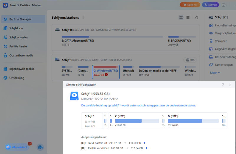 Met Easeus partition master zou je die tussen liggende herstelpartitie kunnen verplaatsen, maar dan vraagt hij om eerst de D te verkleinen?