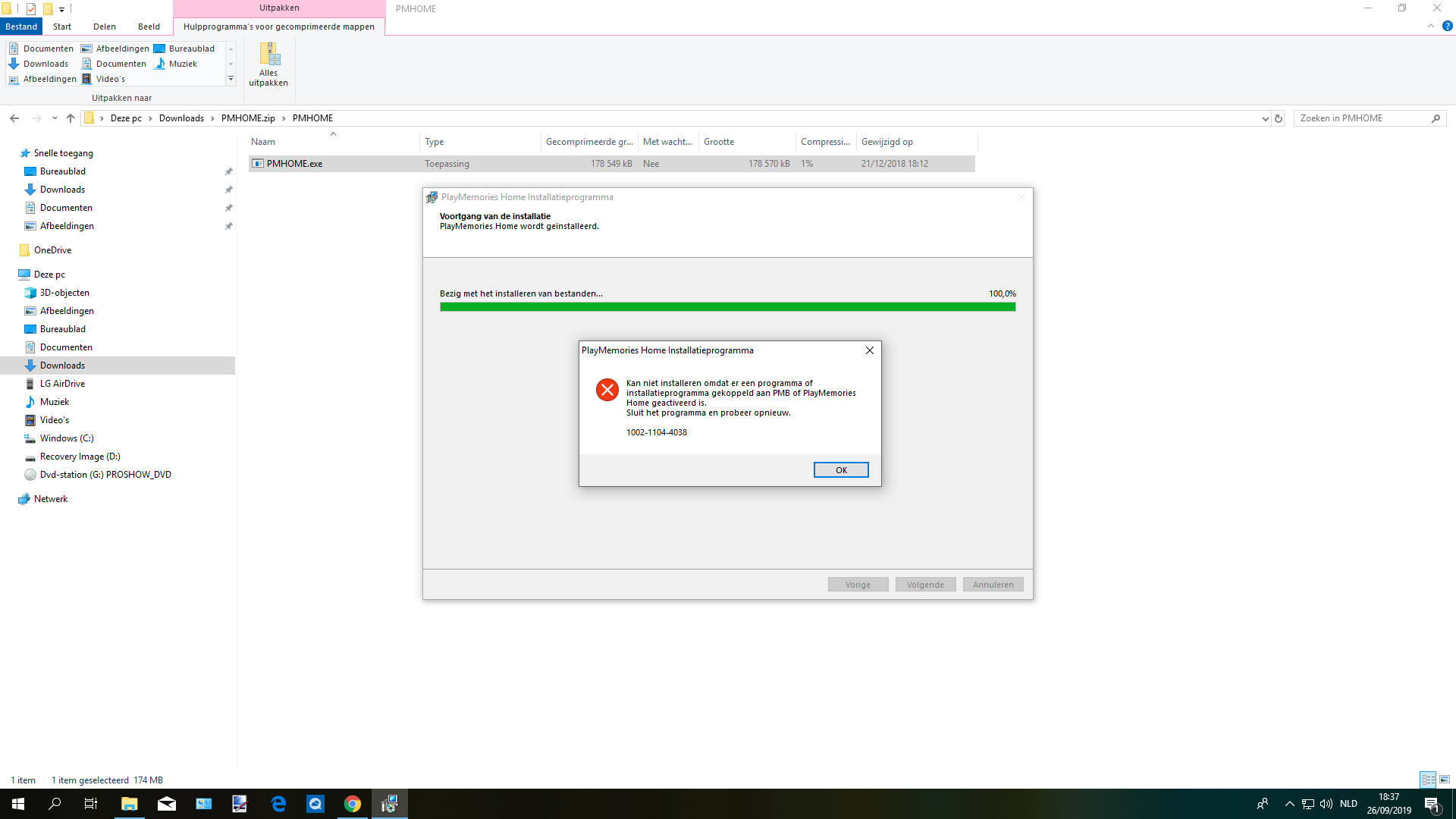 Zo te zien zal die PlayMemories die op Uw computer staat eerst moeten worden verwijderd waarna je opnieuw zult moeten installeren.