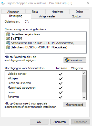 indien het antwoord hier op ja is dan dien je eens de eigenschappen van de C op te halen …via de tap beveiliging Administrators...