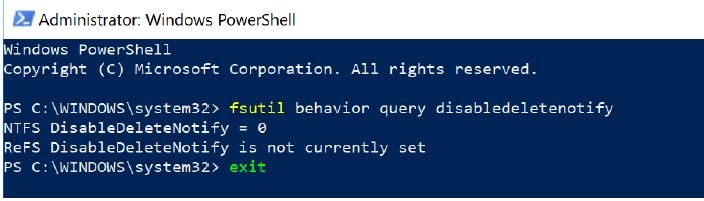 Krijg je de waarde = 0 terug, dan is de Trim actief. Krijg je de waarde = 1, dan activeer je de Trim met fsutil behavior set disabledeletenotify 0 te schrijven of te plaatsen.