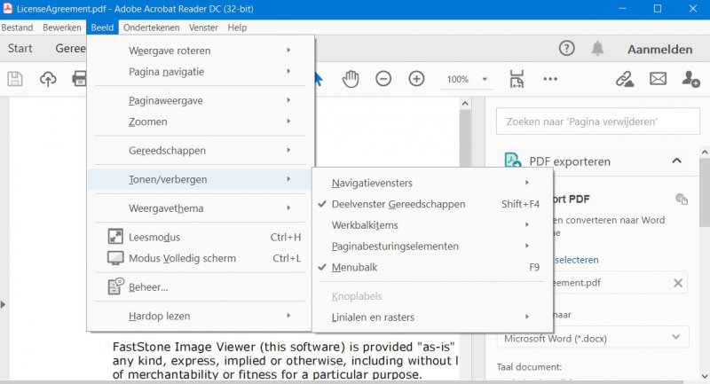 Bestaat de mogelijkheid in Adobe Reader om de zijbalk "Deelvenster gereedschappen" permanent niet te zien.