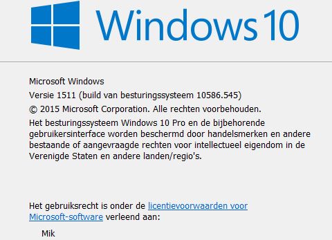 De portable heeft automatisch de upgrade ontvangen terwijl de vaste PC dit niet kreeg. Deze laatste toont versie 1511 build 10586.545