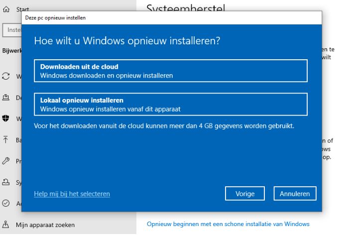 bij het kiezen van Downloaden uit de cloud zal de nodige Windows systeembestanden opgehaald worden .. hoelang dat dit duurt is van meerdere factoren afhankelijk ..