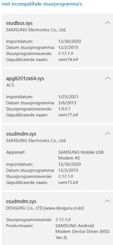 Die zijn wel behoorlijk oud ... dus update van de drivers is volgens mij een goede zaak.In bijlage de details van de drivers die volgens Windows kernisolatie incompatibel zijn.